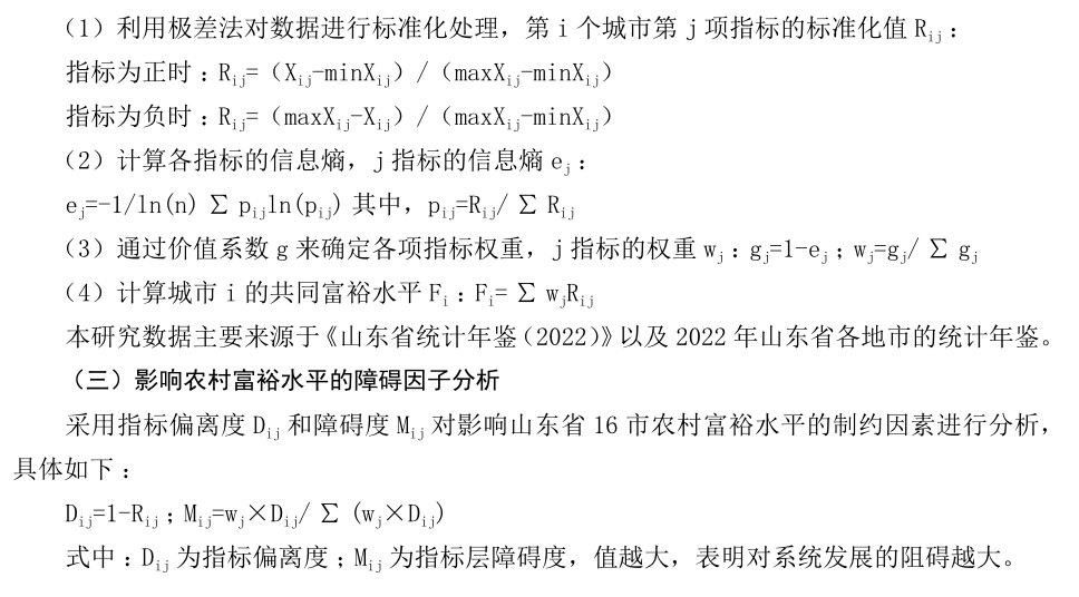 摘要:本研究基于熵值法,从农村生活水平、保障水平以及生产水平三个维度着手,选取代表性指标构建了山东省农民农村富裕评价指标体系,对山东省16市的农村富裕水平进行综合评价,并借助障碍度模型,研究了当下影响山东省各市农民农村富裕水平的制约因素。结果表明:山东省各市之间农村富裕水平存在较大差异,东部沿海地市的农村富裕水平相对更高,推进共同富裕建设的基础也更雄厚;16市之中,只有威海市、青岛市和济南市3个市