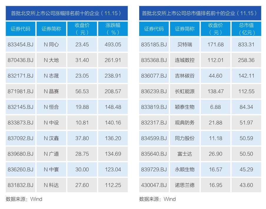 11月15日上午9时30分,主要服务创新型中小企业的北交所正式开市。截至当日下午收盘,首批81家上市公司总市值超2800亿元,全天成交(含大宗交易)超4.8亿股,成交额(含大宗交易)超95亿元。 81家上市公司中,71家是从新三板精选层平移而来,10家为首发上市公司。 北交所对股票交易实行价格涨跌幅限制,涨跌幅限制比例为30%。其中,向不特定合格投资者公开发行的股票上市交易首日