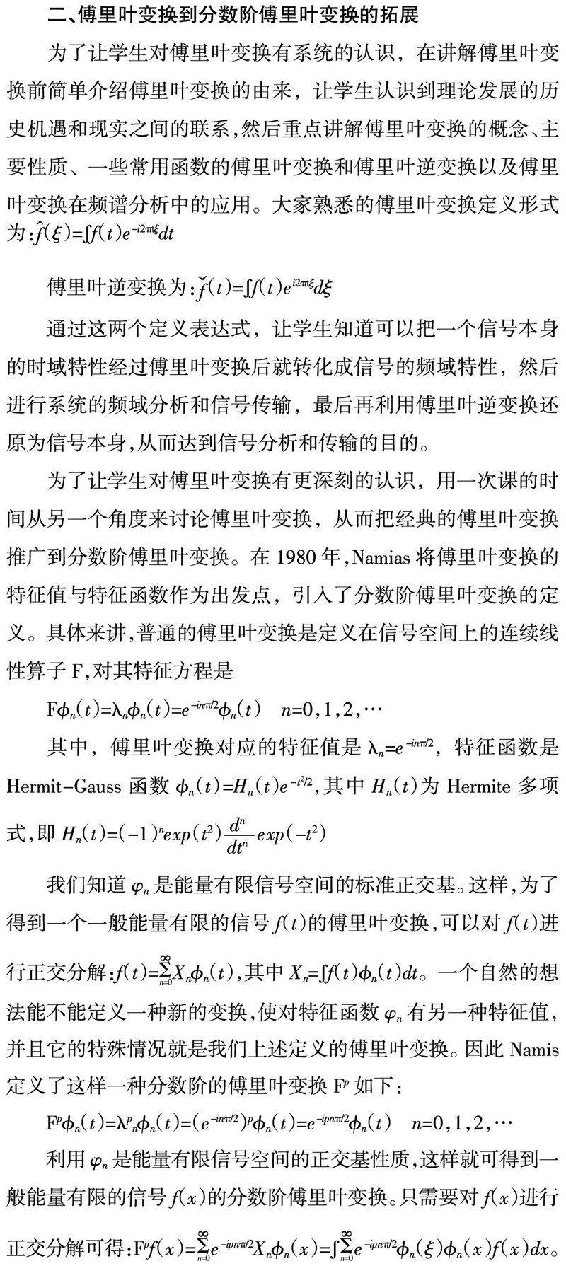 [摘 要] 傅里叶变换作为重要的数学工具在数学学科本身和工程的应用中都起到非常重要的作用,这部分内容也是复变函数和复变函数与积分变换课程中的教学重点和难点。主要讨论如何在傅里叶变换的教学中推广到分数阶傅里叶变换,并探讨它们之间的联系,从而让学生对傅里叶变换的理解更加深刻。 [关 键 词] 傅里叶变换;分数阶傅里叶变换;Hermite-Gauss函数 [中图分类