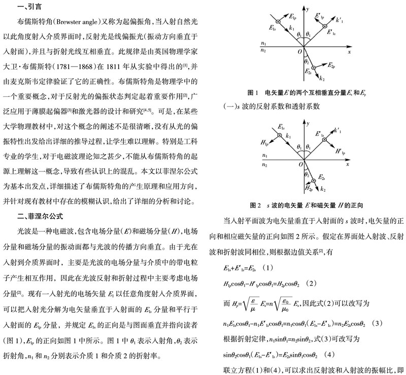 [摘 要] 布儒斯特角是大学物理教学与研究中的典型问题。从电矢量的两个分量(s波和p波)的偏振特性出发,运用边值条件,计算了s波和p波的反射系数对入射角的依赖关系,系统探讨了布儒斯特角的产生条件和应用方向。 [关 键 词] 布儒斯特角;偏振;菲涅尔公式 [中图分类号] G642 [文献标志码] A
