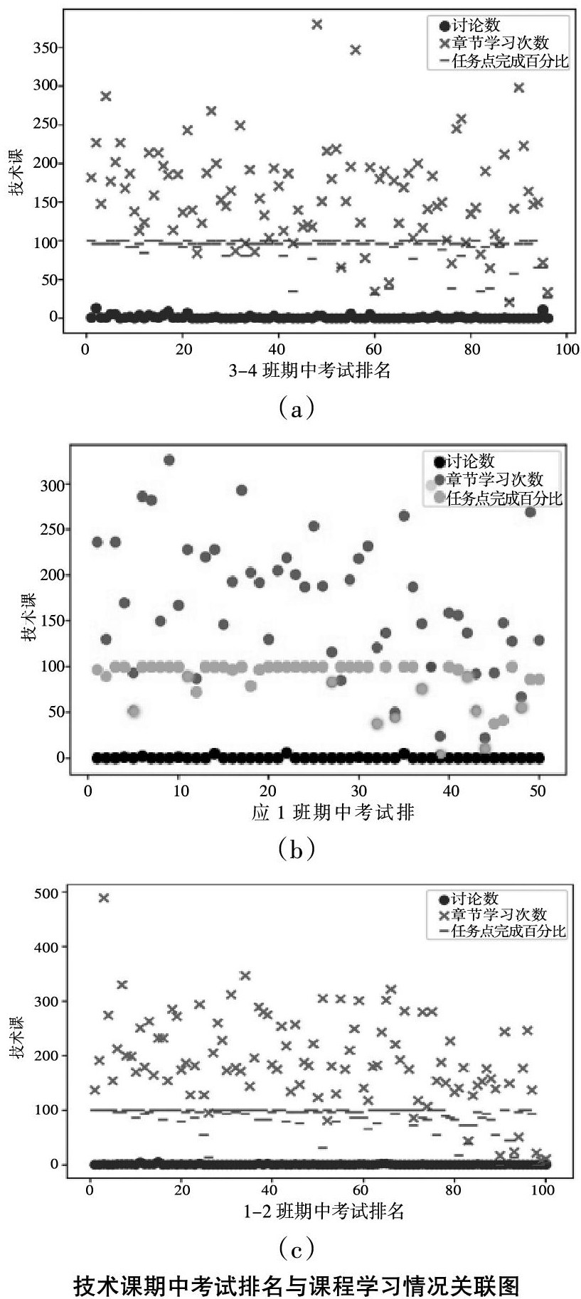[摘 要] 通过分析246名学生两门课的期中考试成绩以及学习通上学生的学习记录情况,尝试分析学生学习效果。探讨学生在超星平台上的学习记录痕迹,包括任务点完成情况、学习时间长度、参与讨论情况,与期中考试成绩之间的关系。通过分析发现,在网络课程中学生成绩与课程章节测试相关系数最高,同时学生成绩与学生完成任务点比例相关性也很高。在线课程中,这些章节测试结果和任务点完成情况都是可以量