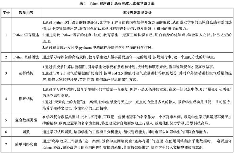 [摘 要] 在课堂教学过程中有效融入思想政治教学元素,是高等职业院校贯彻落实全国高校思想政治工作会议精神的一个重要抓手。以Python程序设计课程为例,分析了该课程的定位和思政育人目标,从教师加强政治理论学习、充分挖掘思政元素进行课程思政教学设计、优化课程教学方法、改进实践教学环节和课程考核方式等方面对本课程的课程思政进行了设计和实践。 [关 键 词] Pyth