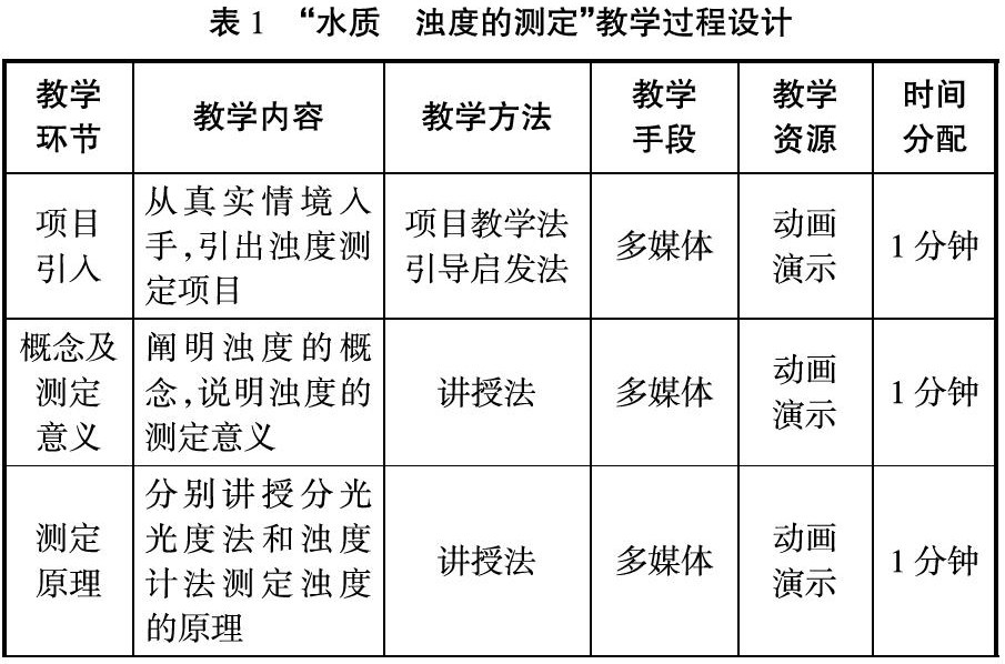 [摘 要] 微课由于时间短、内容精、应用广、效果好等特点,近年来在教学中使用愈加广泛。以环境监测指标检测课程中的“水质 浊度的测定”项目为例,从项目确定、学情分析、教学内容与目标、教学设计四个方面阐述了该项目微课的设计。此外,还探讨了本微课的应用方式和应用效果,以期为后续相关微课的应用提供参考。 [关 键 词] 浊度测定;微课设计;微课应用 [中图分类号]