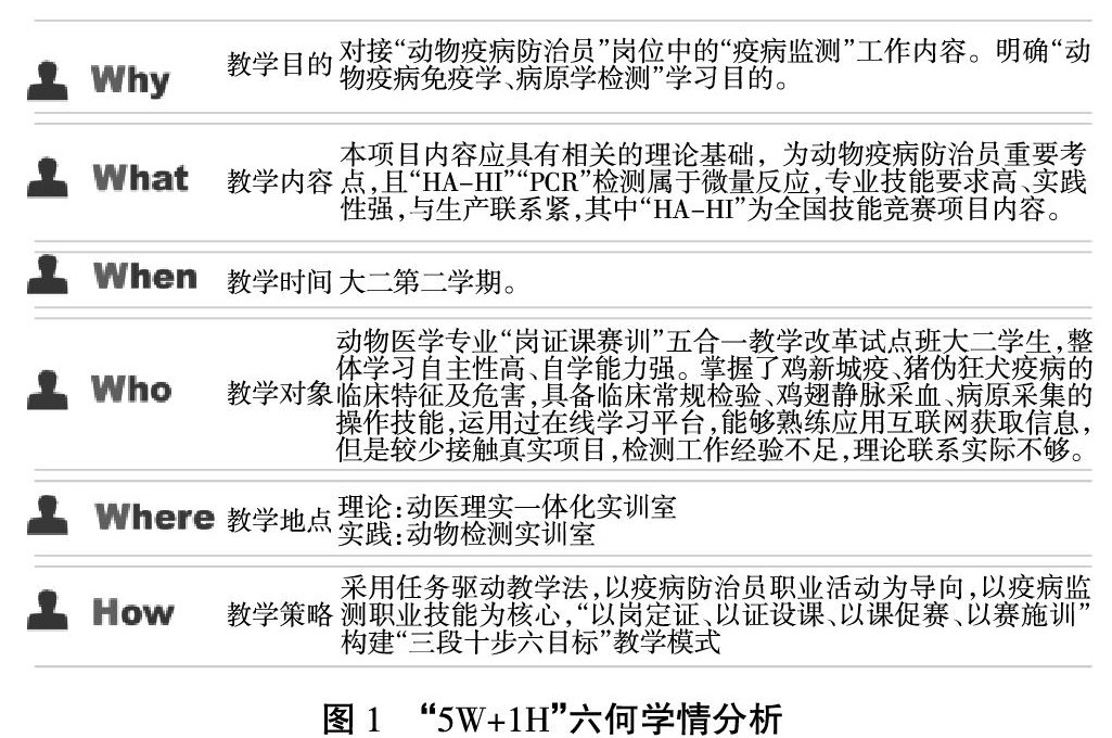 [摘 要] “动物疫病监测技术”是动物医学专业核心课程动物疫病防治技术中模块三疫病控制的重要内容,是培养动物医学专业复合型技术技能人才的重要支撑。采用“5W+1H”六何分析法进行学情分析,构建了“三段十步六目标”教学模式,并对实施成效进行总结和分析,同时反思实施过程中存在的不足及改进措施,旨在更好地服务教学。 [关 键 词] 动物疫病监测;动物疫病防治;教学设计