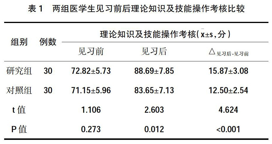 [摘 要] 目的:探讨形成性评价联合PBL教学模式在儿科学临床见习教学中的应用效果。方法:选择2020年11月至2021年1月在我院儿科见习的60名临床医学专业整合课程班四年级医学生作为研究对象。按照教学方法不同随机分为研究组和对照组。研究组采用形成性评价联合PBL教学模式,对照组采用传统教学模式。比较两组医学生见习前后理论知识及操作技能的掌握情况和对儿科学见习教学的满意度。
