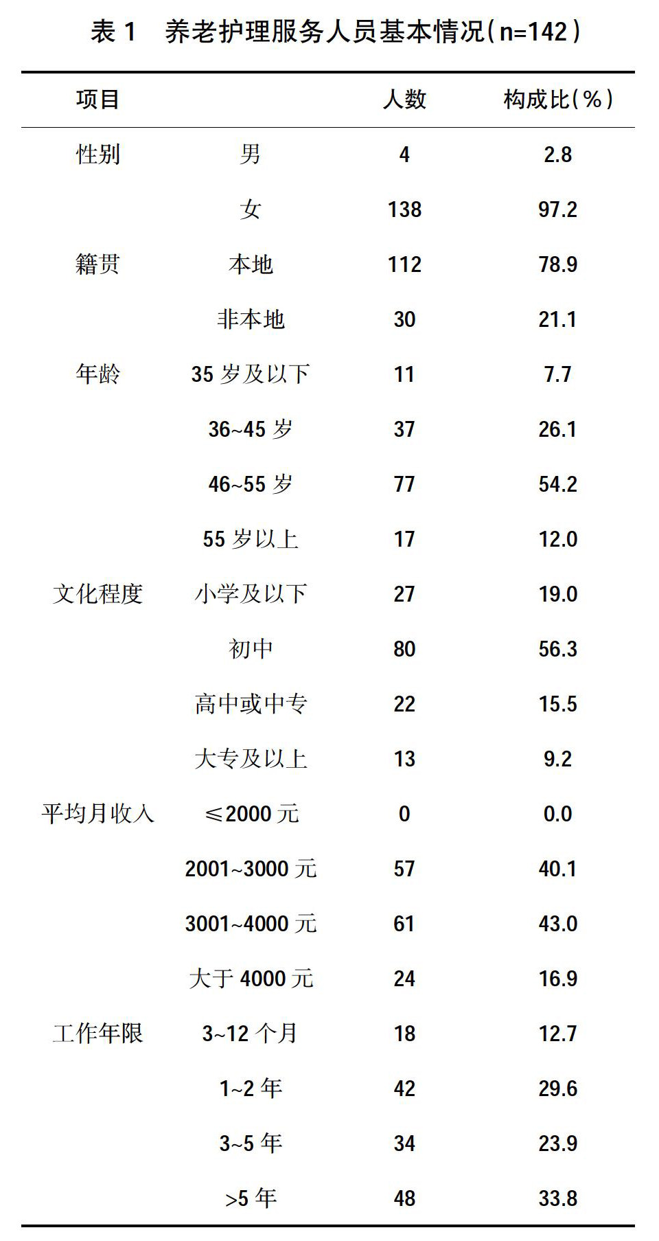[摘 要] 目的:对韶关市区内养老护理服务人员基本情况及培训需求进行调查分析。方法:采用方便抽样方法,对韶关市区三家公立医院及10家养老机构从事养老护理服务行业人员的基本情况和培训需求进行问卷调查。结果:韶关市区内养老护理服务人员受教育程度偏低、男女比例严重失衡、整体年龄偏大、工作时间长强度大、培训需求较强。结论:优化养老护理服务人员队伍结构,对其职业培训专业化、规范化,从整
