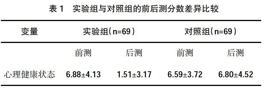 [摘 要] 目的:探索朋辈心理辅导对大学生心理健康状况的干预程度。方法:招募大学生参与者,采用实验组、对照组前后重测设计,结合线上与线下结合的朋辈心理辅导对大学生参与者进行干预,利用《大学生心理健康自测量表》评估干预前后的结果。结果:实验组与对照组前测得分差异不显著,后测水平中实验组的心理健康状况显著好于对照组。结论:朋辈心理辅导对于改善大学生心理健康状况有积极作用。 [关