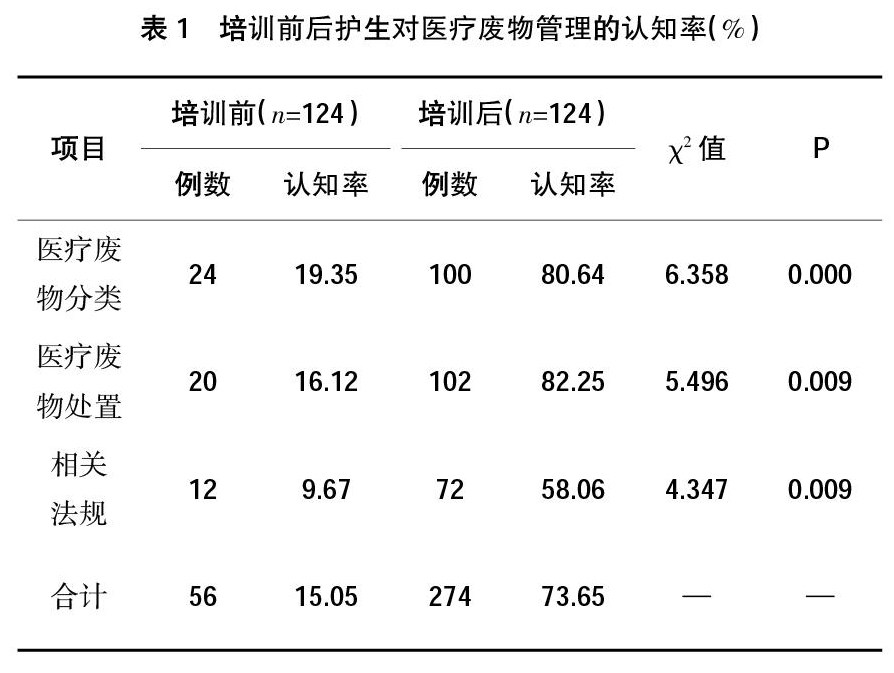 [摘 要] 目的:通过对护生医院感染知识认知情况的现状调查分析,就存在的问题进行培训,提高护生对医疗废物及医院感染知识的认知率。方法:应用自行设计的调查问卷,对124名护理三年级护生进行医院感染知识认知情况调查,根据问卷分析,采用相应的教学方式进行培训。培训结束3个月,再以相同的问卷进行调查,对比培训前后效果。结果:培训前后护生对医疗废物管理、医院感染知识认知率P [关