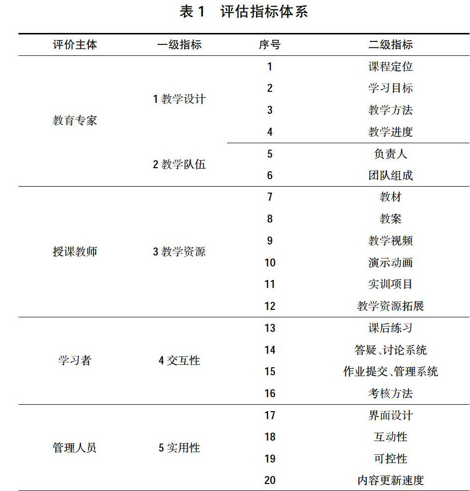 [摘 要] 在线开放课程已经成为现代教育的一种重要途径,在线开放课程评价指标体系的研究对在线开放课程的建设具有指导意义。从参与在线开放课程建设的教育专家、授课教师、管理人员和学习者四类评价主体角度出发,采用多元化的评价机制,确定评价指标、各指标权重和评价标准,形成一套完整的在线开放课程评价指标体系,为评价者客观评价一门在线开放课程质量提供理论依据。 [关 键 词]