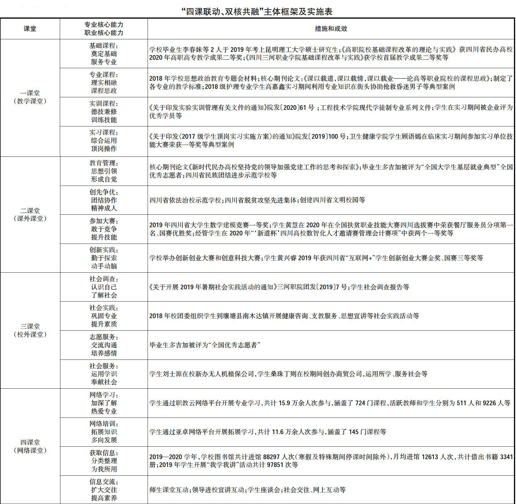 [摘 要] 四川三河职业学院在办学实践中对“四课联动、双核共融”教育教学模式构建与实践进行了探索,以立德树人、为党育人、为国育才为指导,构建了框架和流程。“四课联动”解决了教育和教学“两张皮”,“双核共融”将专业核心能力和职业核心能力熔为一炉,提高了学生的知识、能力和素质,在全校推广,收到了较好的效果。 [关 键 词] 四课联动;双核共融;教育教学模式 [中图