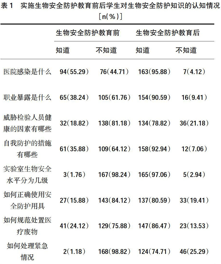 [摘 要] 目的:调查医学检验专业学生对生物安全防护知识的认知情况、生物安全防护情况,探讨生物安全防护教育的方法与效果。方法:选取某高校2019届170名医学检验专业学生作为研究对象。上学期未对学生实施生物安全防护教育,下学期对学生实施生物安全防护教育。采取问卷调查法分别于上、下学期末对学生的生物安全防护知识认知情况、生物安全防护情况进行调查、比较。结果:实施生物安全防护教育