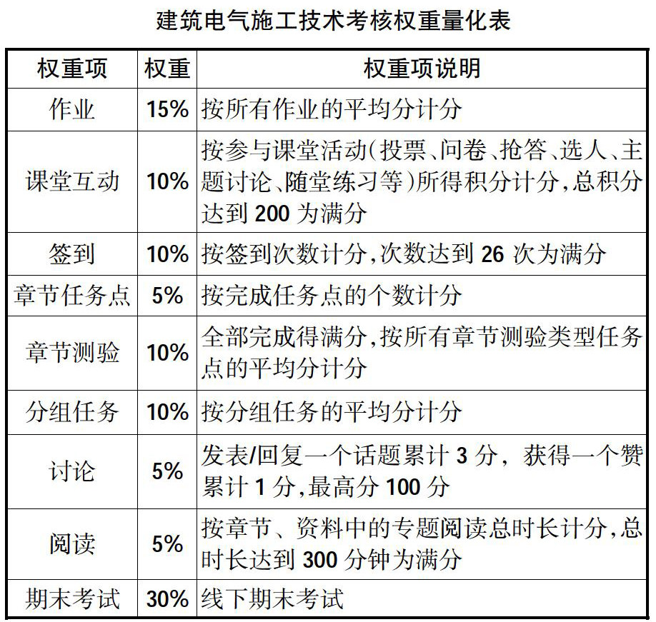 [摘 要] 运用学习通平台将建筑电气施工技术中常用操作技能、知识点等用小视频形式供学生线下学习,线上主要解决学生线下学习过程中遇到的困惑,课程考核评价通过考勤、选人、抢答、主题讨论、随堂练习、分组任务、课后作业、实践操作、章节任务点等多元化线上线下结合方式进行。实践证明,本课程采用线上线下混合式教学方法,扩大了师生学习空间,提高了学生自主学习能力,提升了高职学生技术技能型人才