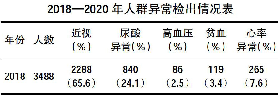 [摘 要] 目的:了解江苏某高校2018—2020年入校的大一新生健康状况,为促进学校预防保健工作提供依据。方法:选择2018—2020年入校参加健康体检的大一新生共10003 例,对体检结果进行统计学分析,并根据体检结果实施相应的健康教育。结果:全部新生中体检结果异常者7061例,发生率为70.6%。按照各种疾病的异常率排序,异常率最高的是近视,其次是尿酸异常、心率异常、高