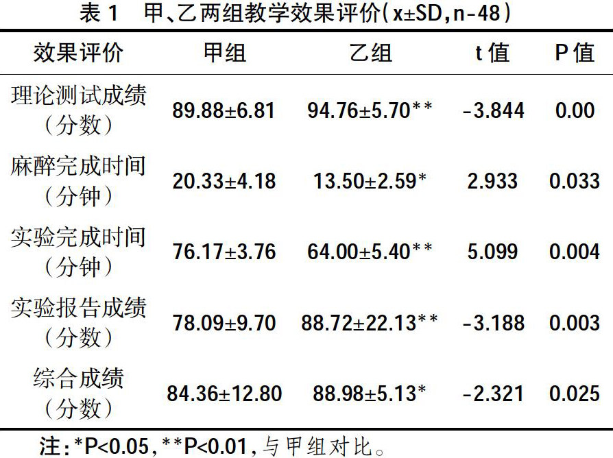 [摘 要] 目的:探讨机能实验学课程线上、线下混合教学模式的教学效果。方法:将2020级临床医学专业学生随机分为传统教学模式组和线上、线下混合式教学模式组,每组48人。通过家兔麻醉完成时间、实验完成时间、理论测试成绩、实验报告成绩、综合成绩及调查问卷的方式来评价教学效果。结果:线上、线下混合式教学模式组的学生课前预习时间较长,家兔麻醉完成时间及实验完成时间均短于传统教学模式组