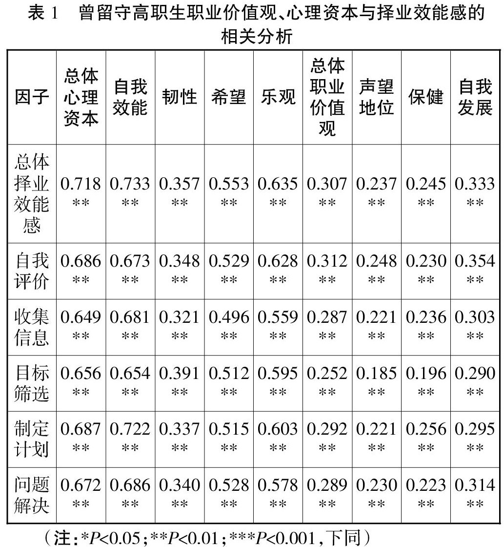 曾留守高职生的职业价值观、心理资本与择业效能感的关系研究