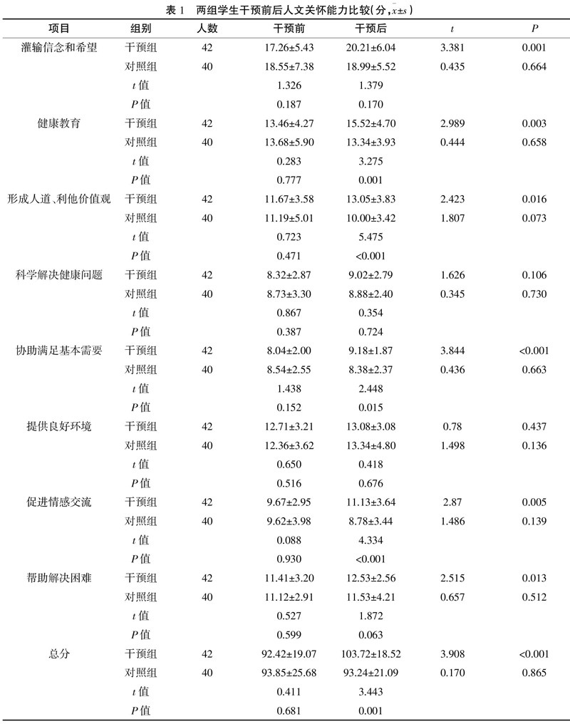 [摘 要] 目的:探讨志愿服务在提升高职护生人文关怀能力中的应用效果。方法:随机抽取湖南省某职业技术学院82名高职护生,随机分为对照组(40人)和干预组(42人),对照组常规参加护士人文修养课程学习,干预组在常规参加护士人文修养课程学习基础上实施养老院志愿服务活动,每两周开展1次活动,每次3小时,共10次。结果:干预后干预组护生在人文关怀能力总得分及健康教育、形成人道及利他价