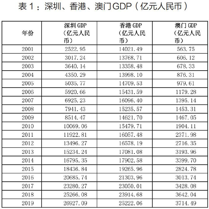 粤港澳大湾区由广东省九个城市以及香港、澳门构成。香港和澳门经济发展起步较早,在很长一段时间内,香港和澳门的经济发展水平远高于广东省。随着我国整体经济快速发展,广东省经济发展水平不仅在全国名列前茅,而且在经济活力及经济创新水平上,逐渐接近香港、澳门。从经济总量上看,香港、澳门远不及广东省,未来香港和澳门的城市发展很大程度上与广东省的发展密切相关。 香港与深圳比邻,随着深圳经济的迅速发展,深圳与香港
