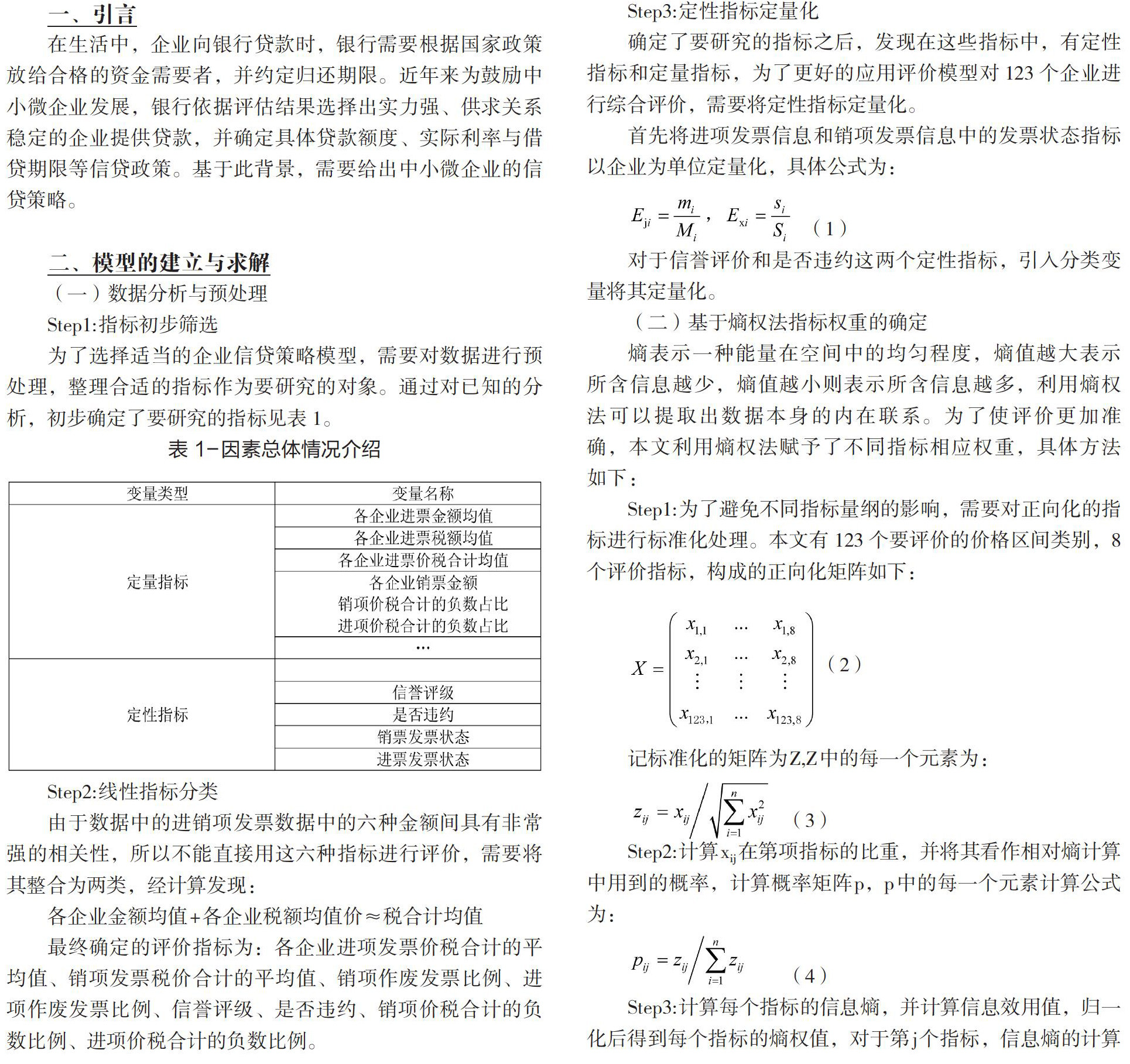 针对问题,首先利用Excel与Stata软件对数据进行预处理与描述性统计,筛选并量化反映企业信贷风险的指标;其次利用熵权法确定了各个指标在信贷风险评价中的权重;然后利用Topsis综合评价模型求得各企业得分,其中分数越高,代表信贷风险越小;最后定义线性模型量化各信贷策略,由此可以给出具体的线性策略模型,在此基础上便于制定对于中小型企业的信贷策略。 一、引言 在生活中,企业向银行贷款时,银行需要