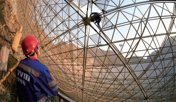 2020年1月9日, 工作人员对FAST反射面板进行检修。 2020年末,曾有一则“中国天眼坍塌”的谣言在网上流传。照片上,工程设施残破一地,看起来十分凄凉。这种“别有用心”的谣言很快就被攻破:照片上的天眼实际上是位于美国的阿雷西博巨型射电望远镜。 美国天眼坍塌事故从另一个角度再次说明,口径巨大、暴露于户外的射电望远镜,对工程技术要求极高,它考验着一个国家在工程设计、施工、材料等等方面的综合能