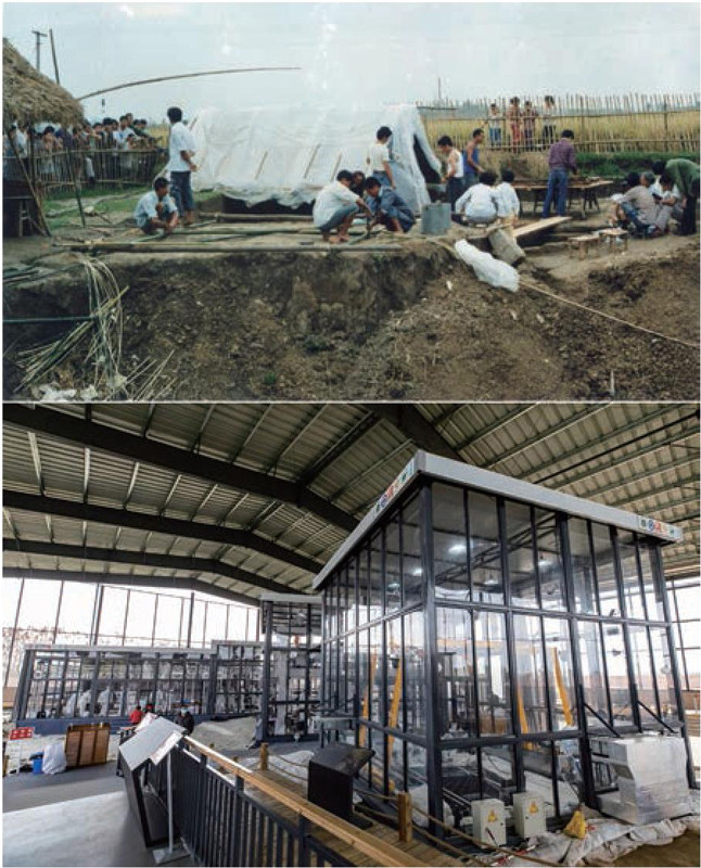 这是一张拼版图片: 上图为1986年,考古人员在三星堆遗址考古发掘现场工作。受限于当时的条件,现场裸露在空气之中,没有被完全封闭保护起来(三星堆博物馆供图);下图为3月10日在三星堆遗址考古发掘现场拍摄的4个大小不同的“考古舱”(新华社记者 沈伯韩 摄)。 4月12日,一件完整的圆口方尊在三星堆3号坑出土。此坑不愧“聚宝盆”之称。 四川省文物考古研究院三星堆考古研究所所长、三星堆遗址考古发掘队