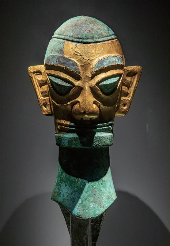 这是在位于四川省广汉市的三星堆博物馆拍摄的1986年出土于三星堆2 号“祭祀坑”的戴金面罩青铜人头像(3月5日摄)。 “蚕丛及鱼凫,开国何茫然!”太白诗仙的感叹和疑惑,其实直到今天依然萦绕在人们心中。 以三星堆为代表的古蜀文明,前后持续一千多年。地理的相对分隔带来文化的相对独立性和发展连续性,让它与同时期的中原文明一脉相承又具有自身特质;它与外国文明也有着充分的交流联系。它充满神秘主义,留下了