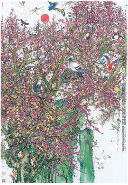 萧晖荣《一带一路 鸟鸣花开》 设色纸本2016年作200×140cm。 近日,“繁花似锦——萧晖荣教授艺术展”将在陆俨少艺术院和荷享艺品同时开幕。展览共展出萧晖荣教授作品100余件(套),包括中国画、书法、文人雕塑等,作品兼备精微与宏大,讴歌祖国的盛世繁华,彰显恢宏的时代精神,体现其对中国传统艺术文化的传承与创新。萧晖荣教授是当代著名书画家、雕塑家、书画收藏家。其工花卉、亦写山水、擅写梅、精雕塑