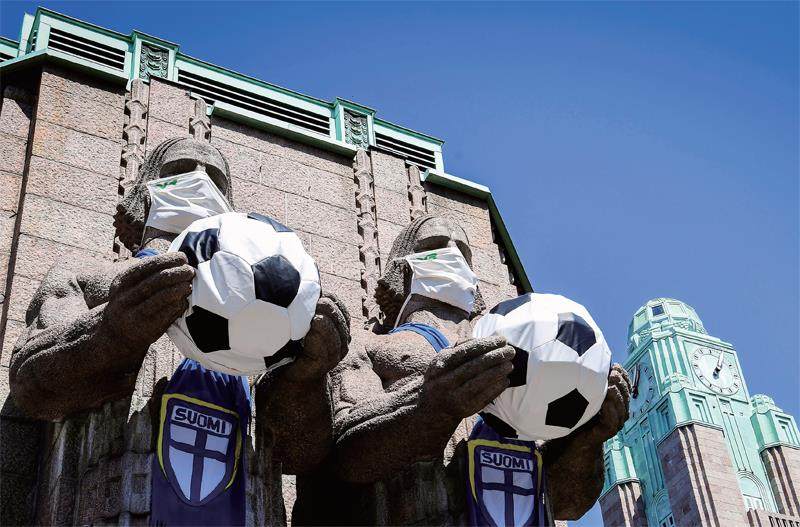2021年6月11日,芬兰赫尔辛基,2020欧洲杯临近,芬兰国家队历史首次站在欧洲杯的赛场上,赫尔辛基中央火车站巨人雕像也被打扮成了球迷模样,为芬兰国家队助威。 2020欧洲杯,真是一届不一样的欧洲杯。 最大的不一样——迟到了一年,因为疫情,这届欧洲杯在2021年才开赛。当期待已久的球迷在这个夏天终于“品尝”到这道绿茵大餐时,又感受到全新的观赛方式——欧洲杯首次在十个国家一起开赛。究竟哪家是主