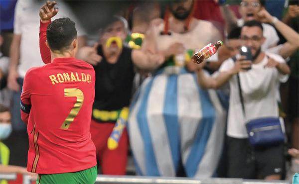 2021年6月23日,2020欧洲杯F组小组赛第3 轮,葡萄牙对阵法国,C 罗庆祝进球时场内飞进可乐瓶。 “扎卡还留在欧洲杯,C罗却走了!” 北京时间6月29日凌晨,娱乐与体育电视网英国频道(ESPN UK)看似平静的语调,却一语道破了本届欧洲杯的一种尴尬。按说扎卡身为队长的瑞士队淘汰法国,与葡萄牙队的C罗没啥关系,可ESPN并不是在硬扯。这一切,都与自1988年首次签约赞助欧洲杯的饮料品牌可口