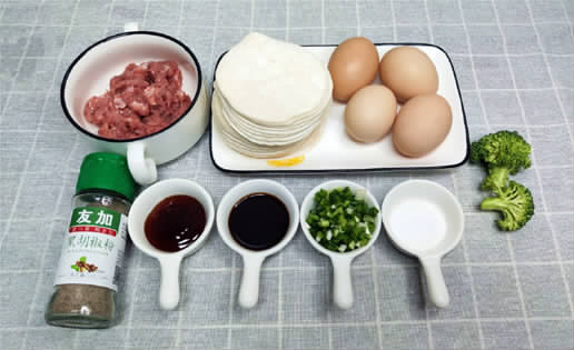 香煎玫瑰卷 这道早餐,不仅颜值超高,而且简单美味有营养,还没出锅就能轻易俘获你的味蕾。 ◎食材:饺子皮20张,猪肉馅60克,鸡蛋4个,蚝油1勺,葱花、胡椒粉、生抽、油、盐适量 ●步骤: 1. 猪肉馅中加入1个鸡蛋、葱花、盐、蚝油、生抽、胡椒粉,顺着一个方向搅拌均匀。 2. 将5张饺子皮连起来均匀摆放,饺子皮相叠处涂点水,起到粘连作用。 3. 把馅料均匀铺在饺子皮上,注意别放