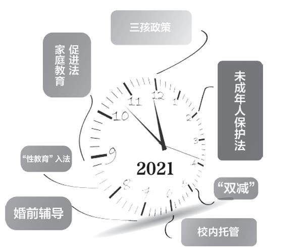 | 策划人小语 | 转眼间,2021年已经接近尾声。 回望这一年,家庭领域新政策新法律新举措纷纷出台:《家庭教育促进法》、三孩政策、修订后的《中华人民共和国未成年人保护法》与《中华人民共和国预防未成年人犯罪法》同时施行、《未成年人学校保护规定》出台,“双减”政策正式实施、“性教育”入法……不仅带来了新气象,也为更多家庭带来更有力的保障。 本期策划,我们将带你一起倒拨时钟,回望这一年家事领域的