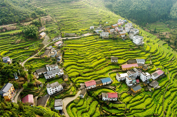 浙江 2021年3月29日,浙江省衢州市开化县长虹乡台回山村,层层梯田村落,油菜花开正艳,花海美如画。台回山村与江西婺源交界,100余户人家,从山脚到山腰,房前屋后都是梯田,被称为“江南布达拉宫”。开化县是钱塘江的发源地,是国家级生态县,地形以丘陵为主,素有“九山半水半分田”之称。 江西 2021年4月13日,镜头下的江西省吉安市永丰县佐龙乡捞塘村水稻田,像一块巨大的调色板。永丰县远