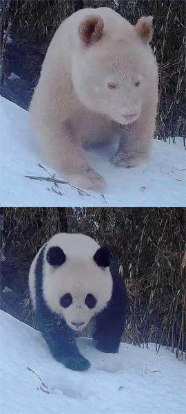 上图为全球唯一的白色大熊猫正面照,下图为大熊猫。图片|四川卧龙国家级自然保护区管理局 5月27日,四川卧龙国家级自然保护区管理局首度公布了全球唯一的白色大熊猫正脸照,没有“黑眼圈”的变异大熊猫引发网友关注。 此前,天津七里海自然保护区内于今年2月拍摄到一只全身白色的麋鹿;北京开展野生鸟类调查时,也发现有白化喜鹊、白化麻雀和白化普通鸬鹚等。 自然界中,白化动物是一个奇特的现象,虽然罕见,但在各