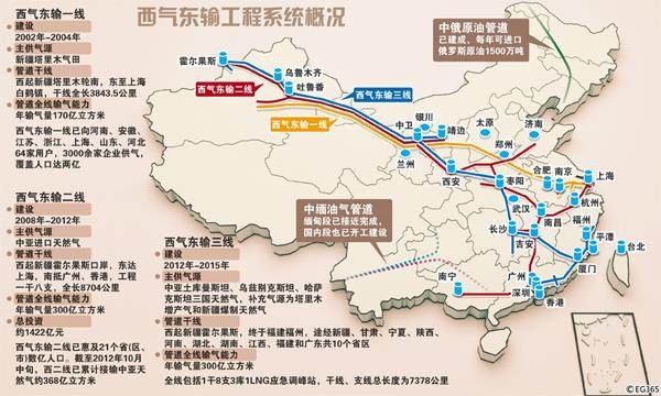 西气东输工程西起新疆塔里木盆地,东至上海,是我国距离最长、口径最大的输气管道。全线采用自动化控制,供气范围覆盖中原、华东、长江三角洲地区,全长4200千米,堪称拉开“西部大开发”序幕的标志性建设工程。 2015年6月,上海实现城市管道燃气的全天然气化。自此,上海居民的换煤气罐成为历史。让上海居民生活发生改变的就是西气东输工程。本世纪初投产的西气东输管道(一线)工程以及此后相继建成的西气东输二线、