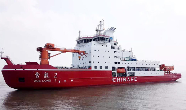2019年7月11日,我国第一艘自主建造的极地科考破冰船“雪龙 2”号在上海正式交付使用,正式加入我国极地考察序列。它是全球第一艘采用船艏、船艉双向破冰技术的极地科考破冰船,具备全球航行能力,能满足无限航区要求,拥有智能船体和智能机舱等多个智能符号,装载多项国际一流水准的科考设备。 “雪龙2”号船长122.5米,型宽22.32米,设计吃水7.85米,设计排水量13996吨,航速12~15节,续航