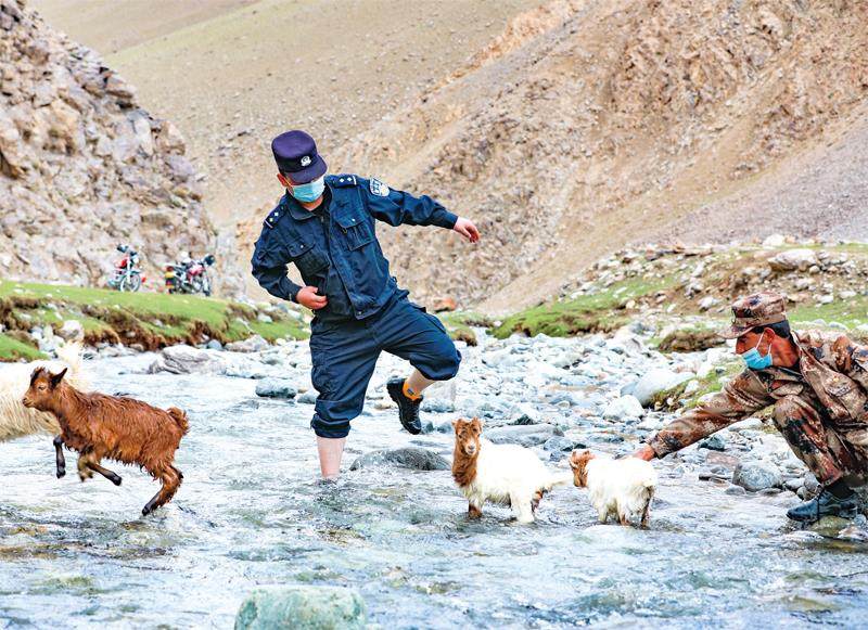 6月12日,新疆喀什,由驻村警务室民辅警组成的5个护牧分队坚持随牧作业,全程跟进保障牧区牧民、牲畜转场,并及时收集群众急难愁盼等民生问题,宣讲各类法律法规政策,全力确保牧民在边境前沿生产作业安全有序。(图片来源:人民视觉) 6月12日,贵州省黔东南苗族侗族自治州从江县谷坪乡盆弄村的学生在从江县交通运输综合行政执法大队海事航务中队工作人员护航下乘坐船只去上学。(图片来源:CFP) 6月13日,湖