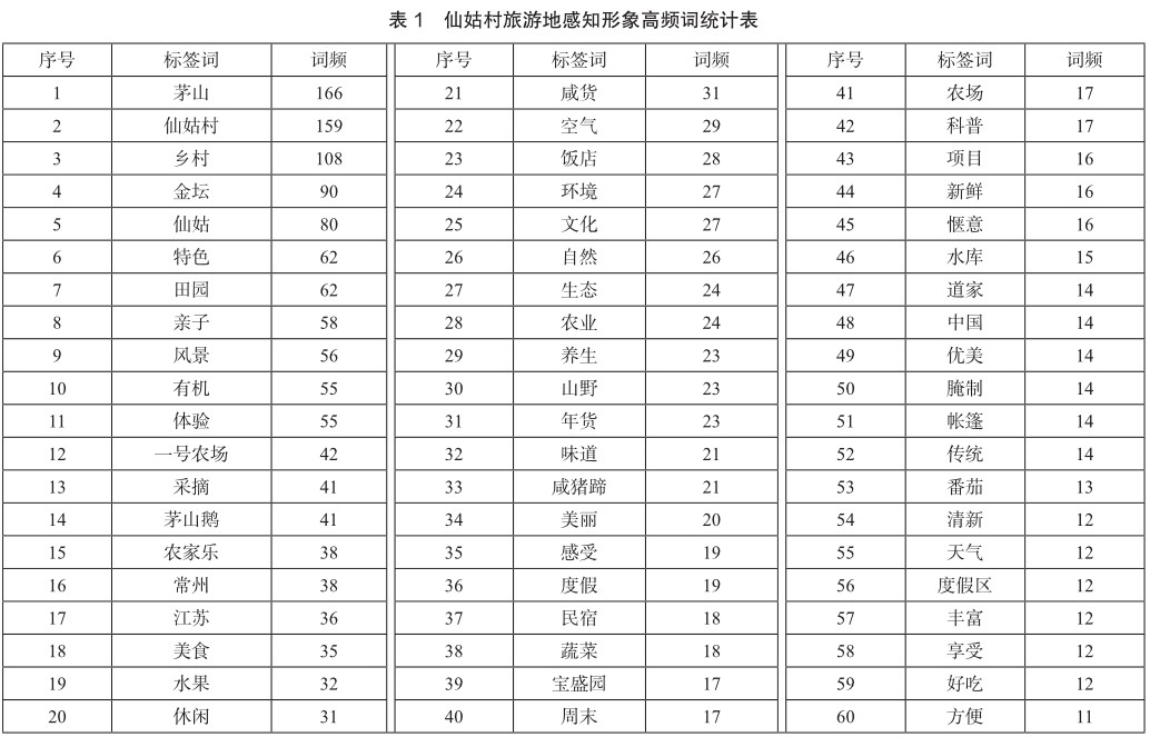 摘 要:在乡村振兴战略的背景下,乡村旅游地形象研究尤为重要。本文以常州市金坛仙姑村为例,运用Rost软件进行网络文本分析,提取游客对仙姑村感知形象的高频词,并分类目进行分析。研究表明,游客对仙姑村的形象感知多倾向积极方面,消极感知主要来自乡村旅游基础设施及旅游经营管理方面。基于此,笔者提出加强农民教育培训、完善基础配套设施、开发特色乡村旅游产品、加深景区合作客源共享等乡村旅游目的地提升的建议。