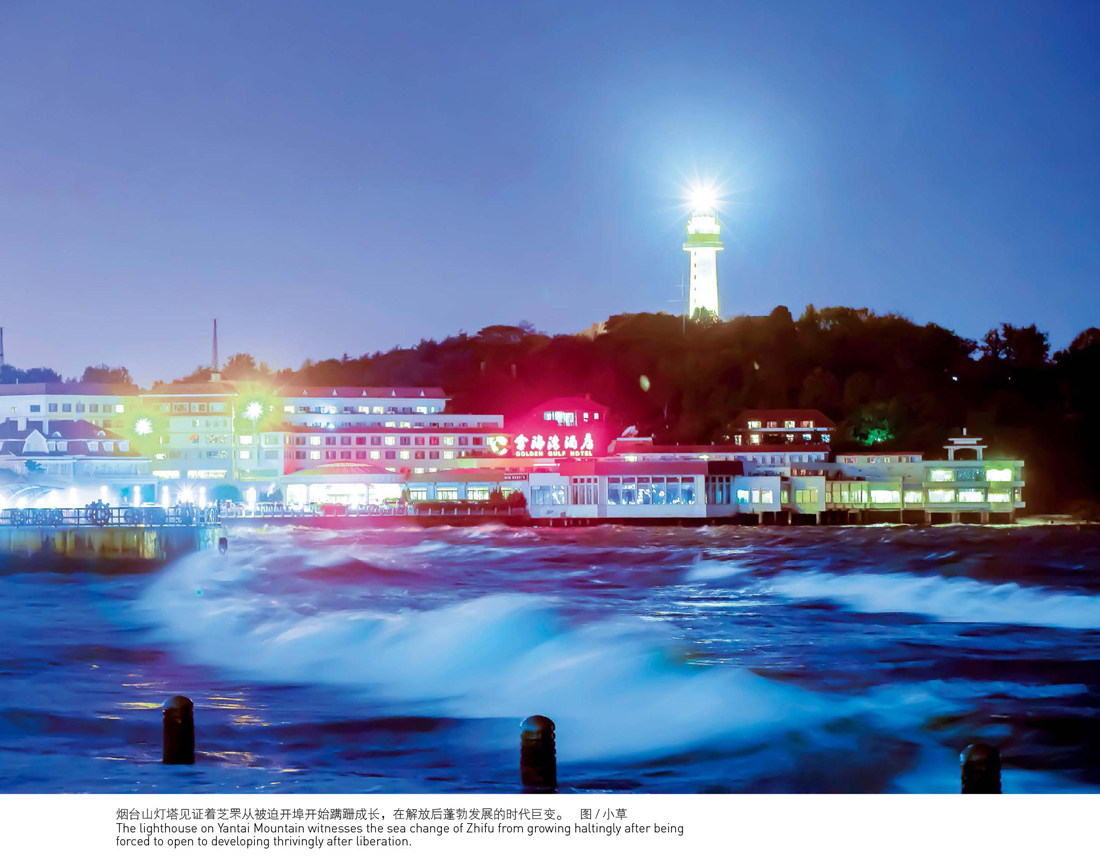 “这里有始皇东巡的传说,这里是烟台开埠的摇篮。 这里有碧波万顷的港湾,这里是灵芝守护的家园。 这里有葡萄美酒的醇香,这里是民族工业的发端。 这里有海防精神的延续,这里是文化交融的前沿。 这里有现代都市的繁华,这里是山海环绕的芝罘。” 当你漫步在滨海广场,看海天一色、品云卷云舒时,视线总是不由自主地被不远处的白身红顶的烟台山灯塔所吸引。自1868年烟台山的烽火台建起了灯楼和旗杆,这座历经百