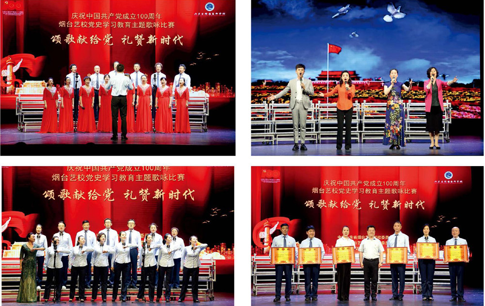 6月11日,在中国共产党100周年华诞即将来临之际,烟台艺术学校在学校实验剧场,举行“颂歌献给党礼赞新时代”——庆祝中国共产党成立100周年教职工歌咏比赛,学校100多名教职工参加比赛,700多名师生观看了演出。 全校共有六个合唱队参赛,每队演唱两首歌曲,一首是指定曲目,另一首是自选曲目。比赛中六支合唱队将朗诵、表演等多种形式融入其中,共同唱响心中的赞歌,以奋发进取、昂扬向上的精神风貌向党的百年