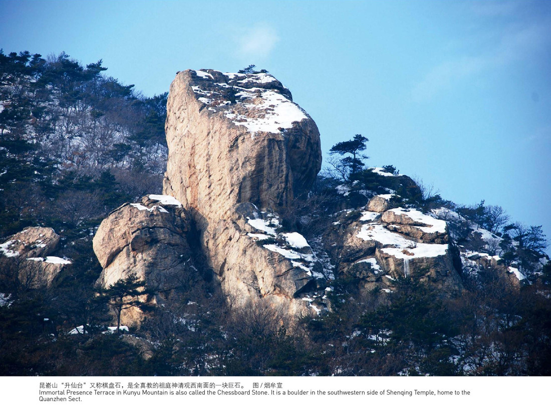 昆嵛山“升仙台”又称棋盘石,是全真教的祖庭神清观西南面的一块巨石,高约20多米,当地人说,八仙中的铁拐李和吕洞宾曾来过这里。 为什么叫升仙台呢?其中有一段传说故事。 据传,在很久很久以前,昆嵛山下住着一位以打柴为生的李姓青年,有一天他来到了烟霞洞附近砍柴。 当他来到这块巨石下的时候,忽然上面扔下一个刚被吃过的桃核。他想春节刚过,桃树怎么会有果子呢? 疑惑间,他听到上面有人说话,便爬上了岩石