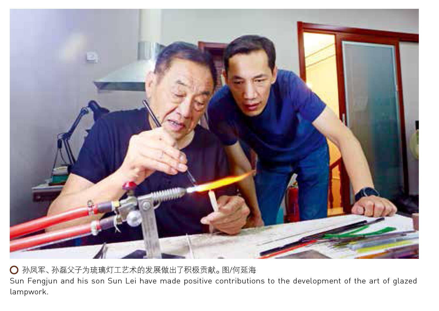 COLORED GLAZE FAMILY CONTINUES ALEGEND 在国家级非物质文化遗产博山琉璃烧制技艺的发展史上,形成了许多世代传承琉璃艺术的家族,有着“中国琉璃葡萄孙”之称的孙凤军即出自著名的琉璃世家。 在博山,说起琉璃灯工,就绕不开孙凤军。1952年,孙凤军出生于博山,自幼随祖辈学习琉璃炉工技艺,这为其日后进行琉璃灯工制作打下了坚实基础。 在传承博山琉璃精华的基础上,孙凤军