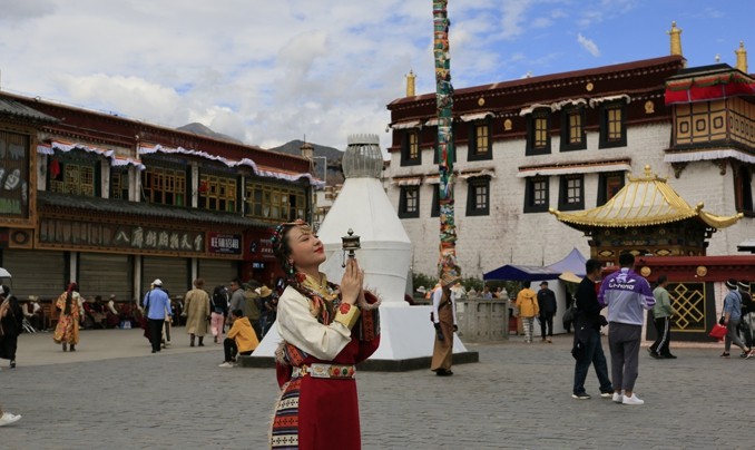 在喜马拉雅山北侧的雪域高原上,有一座闻名遐迩的国际旅游城市——拉萨。在这个被誉为日光城的市区,一簇气势恢弘的古堡式建筑群依山傍水而建,它就是被誉为世界十大名建筑之一的布达拉宫。 这个历史悠久洋溢着炽烈民族色彩的古城堡,坐落在市区西北的玛布日山上,依山耸立的重叠楼宇与坚硬陡峭的岩石削壁融为一体,高耸入云,俯视四方。蓝天碧空下,红白相间的城堡和壮丽炫目的鎏金塔顶错落嵯峨,凌天耸峙中展示着宫殿、寺院、