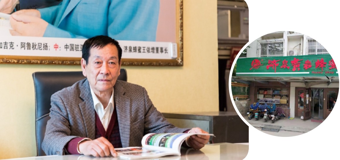 离济南市英雄山路主干道不远,有一条幽静的小巷,一排高大的树木,枝繁叶茂,把夏日部分热浪挡在了外面。往里面走,远远便有蜜香飘来。尽头有家店,里面各种蜂产品琳琅满目,蜜香弥漫——这里便是济泉黄岩蜂蜜的销售总部。 “济泉黄岩蜂蜜”最早可以追溯到50余年前。1969年,其创始人王依增来到济南安营扎寨,开始售卖蜂蜜。他凭借着对蜂蜜这份甜蜜事业的热爱和专注,对品质的严格把控,事业不断壮大——1989 年