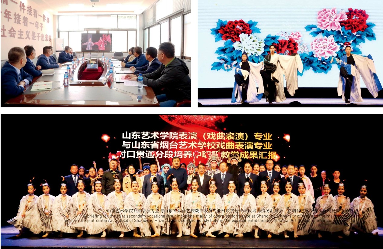 10月10日上午,山东艺术学院戏曲表演专业与山东省烟台艺校戏曲表演专业对口贯通中职段培养情况汇报会,在烟台艺术学校实验剧场隆重举行。山东艺术学院院长徐青峰等4名学院领导、烟台市政府总督学刘永涛等参加活动。 徐青峰等观看了学校戏曲表演等专业课堂教学,听取了学校两年来的对口贯通分段培养教育教学情况,观看了汇报演出,对烟台艺术学校戏曲表演专业“3+4”中专本科对口贯通培养教学工作取得成