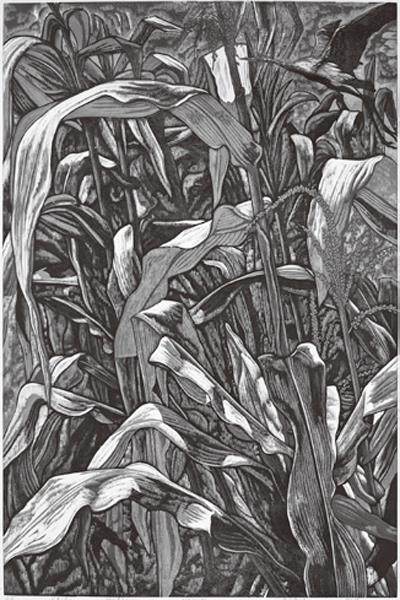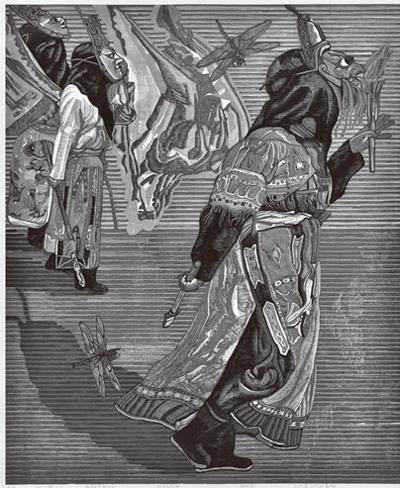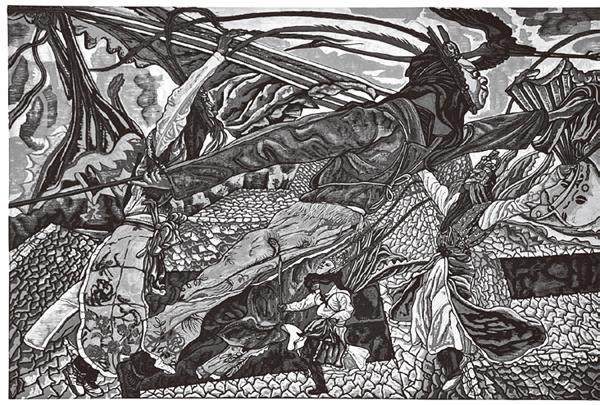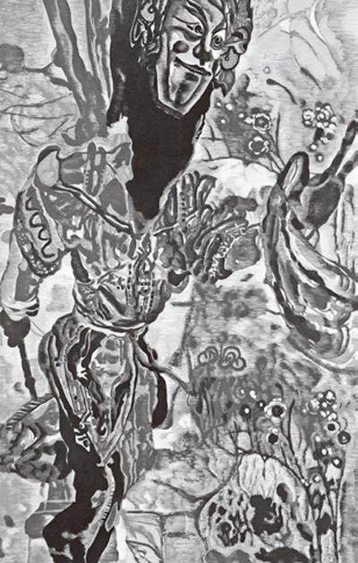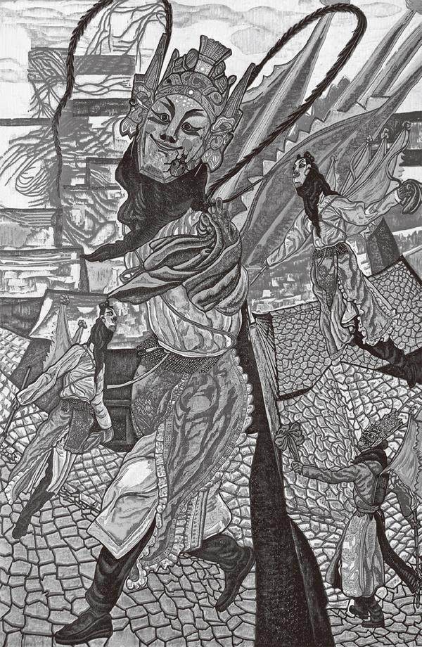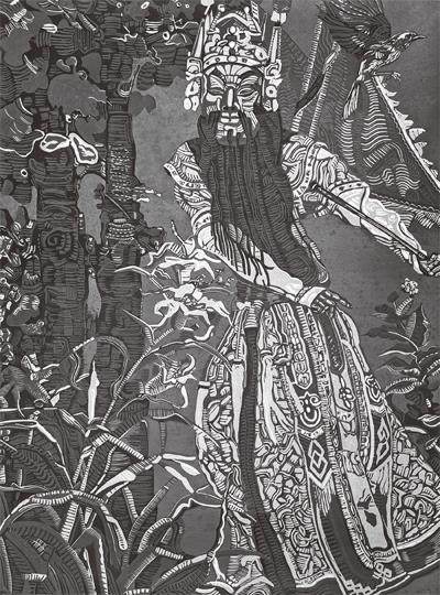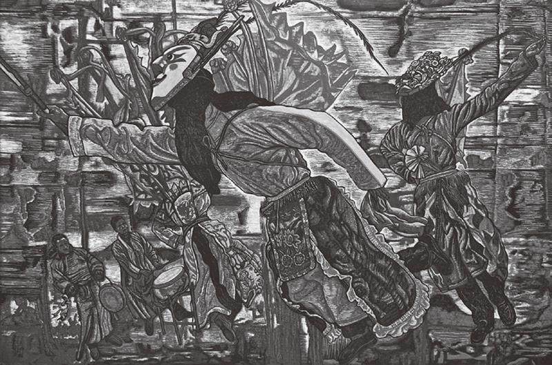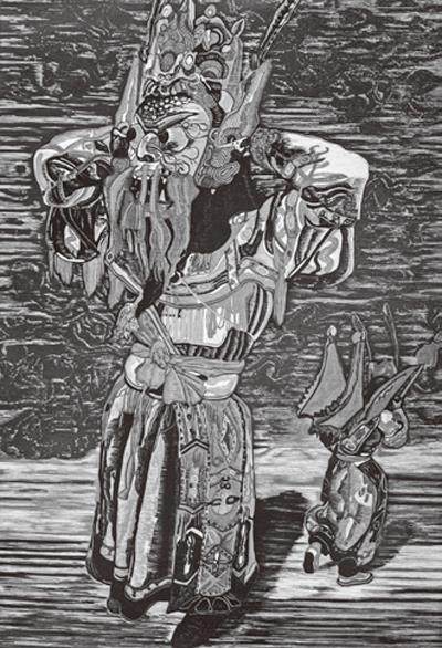 朱世伟幼年就喜欢绘画,作为贵州青年艺术家中代表人物的他,在近几年也以优秀的作品不断走进大众视野。在这几年他发表了大量版画作品,如《迷离花盛》《屯山蝶韵》《云游》等中,具有皮影形象特色的地戏人物、盛放的花、翻滚的云、粗糙的石板路,还有各式憨态可掬的昆虫都是其版画中常见物象。我认为,朱世伟在艺术造型上的成功,似乎是得益于传统皮影艺术的形象设计,又受到民间雕塑的启示,而他对构图的装饰性处理和色彩的强烈对