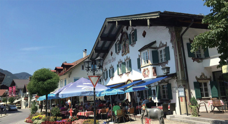 小镇露天咖啡厅、酒吧 德国小镇奥伯阿梅尔高坐落在阿尔卑斯山脚下,四面群山环绕,峰峦叠翠,林密水丰,自然风光十分秀美。奥伯阿梅尔高之所以能成为享誉全球的旅游、度假胜地,除了天赐的自然之美外,主要是因为这个仅百十户人家的小镇,每家每户外墙上都绘有精美、艳丽的壁画。徜徉小镇中,仿佛走进了一座露天壁画博物馆,正因如此,奥伯阿梅尔高赢得了“壁画小镇”的美誉。 古老小镇生机盎然 一早,从德国菲林市乘坐大