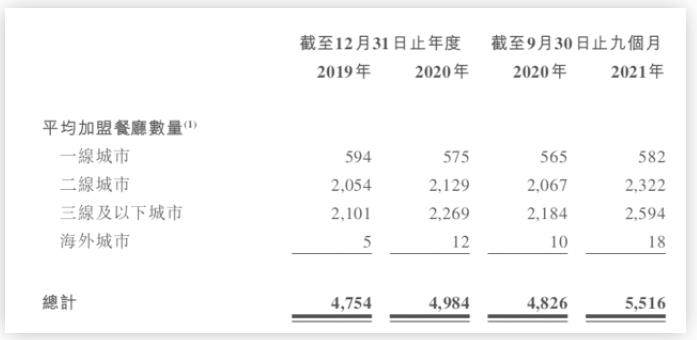 虽然加盟餐厅的运营业务收入占据了杨国福麻辣烫总收入的九成,但加盟费并不是其收入的主要来源。 根据招股说明书,杨国福麻辣烫向加盟商收取的相关费用包括:加盟费、系统维护费、培训费用和保证金。 根据杨国福官网披露,不同地域店铺,支付的加盟费用不同,从乡镇到一线城市,加盟费用为6900元/年至3.99万元/年不等。 2019年、2020年、2021年截至9月30日,杨国福麻辣烫来自加盟费及系统维