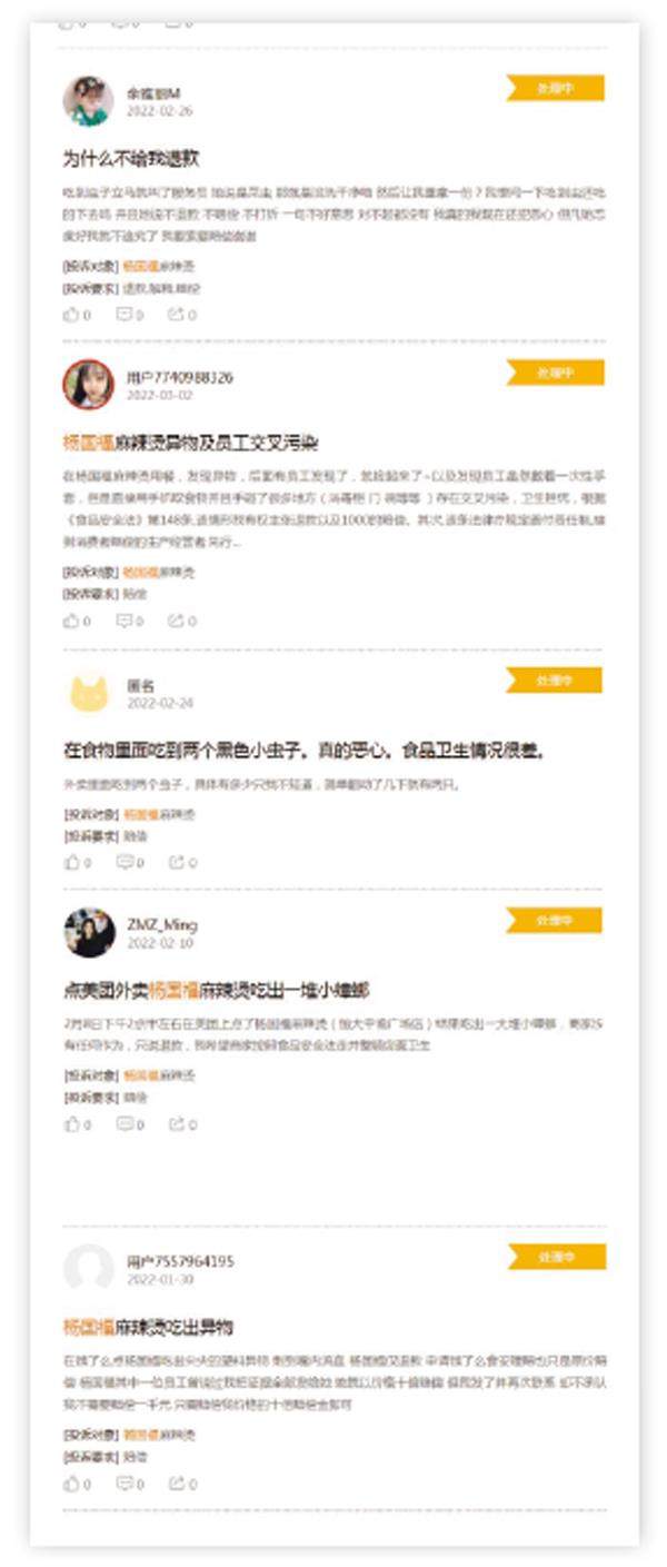 在杨国福加速扩张的同时,食品安全问题已经成为其头顶上的“达摩克利斯之剑”。 近5年来,杨国福多个门店被爆食品安全问题。新浪旗下消费者投诉平台——黑猫上,搜索杨国福一共显示204条投诉。 在本地生活及信息交易平台大众点评网上,对于杨国福食品安全方面的吐槽也不在少数。 虽然在麻辣烫领域拥有较高的知名度,但杨国福麻辣烫关于食品安全的舆情从未中断过。 2017年3月,有媒体报道在某