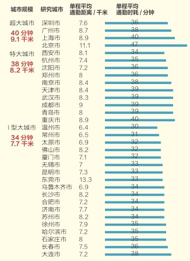 通勤效率度量着一座城市的友好和宜居程度,45分钟以内,是打工人的通勤体面,多项政府规划也都将45分钟通勤比重达到80%以上作为重要目标。 数据显示,2020年,中国主要城市45分钟以内通勤比重总体平均水平76%,其中超大城市68%、特大城市73%,尚有较大提升空间,并且,全国仍有超百万居民的通勤时长在1个小时以上,其中,北京比重最高,达到27%。 一般来说,城市越大,居民的通勤半径也会越大,如