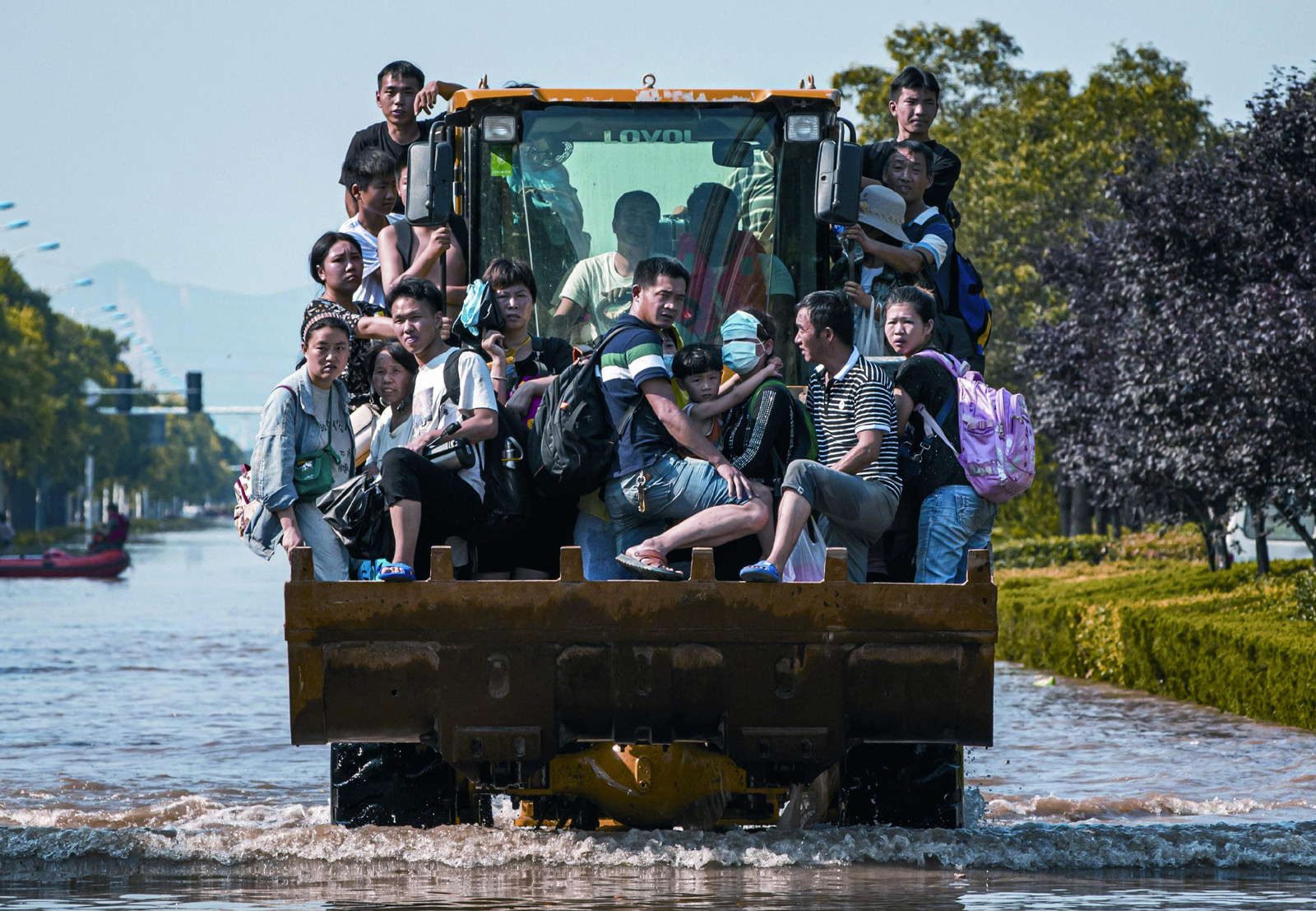 2021年7月24日,河南省新乡市,受灾群众乘坐铲车前往安置区 有个眼神我一直没有忘记。 7月24日,我站在一辆铲车驾驶室外的一处踏板上,铲车行驶在新乡市一条被洪水淹没的街道。在车的左前方,我看到了一家三口人。母亲和儿子走两边,各拿着一根竹杆,父亲在中间扶着一个白色的泡沫箱,里面装着他们的“家当”。洪水已没到他们的胸口,每一步的行走都显得谨慎且艰难。 我搭乘的铲车从他们面前驶过时