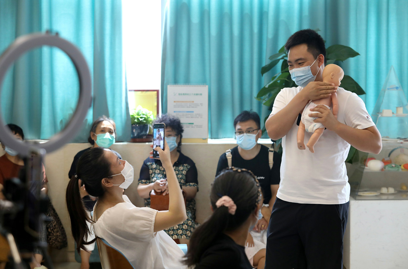 2021年7月10日,石家庄市妇产医院孕妇学校,“准爸爸”们在医生的指导下进行新生儿护理动作练习 “它天天在我身体里头会动,感觉太好了。”田甜感受着腹中孩子的生命力一天比一天强烈,再有几天,这个虎宝宝就要出生了,初为人母的幸福感笼罩着她。 这个小生命来之不易,34岁的田甜盼了5年,是个试管婴儿。 一年前,久备不孕4年之后,田甜接受了辅助生殖,从她卵巢里取出的卵子和从丈夫体内取出的